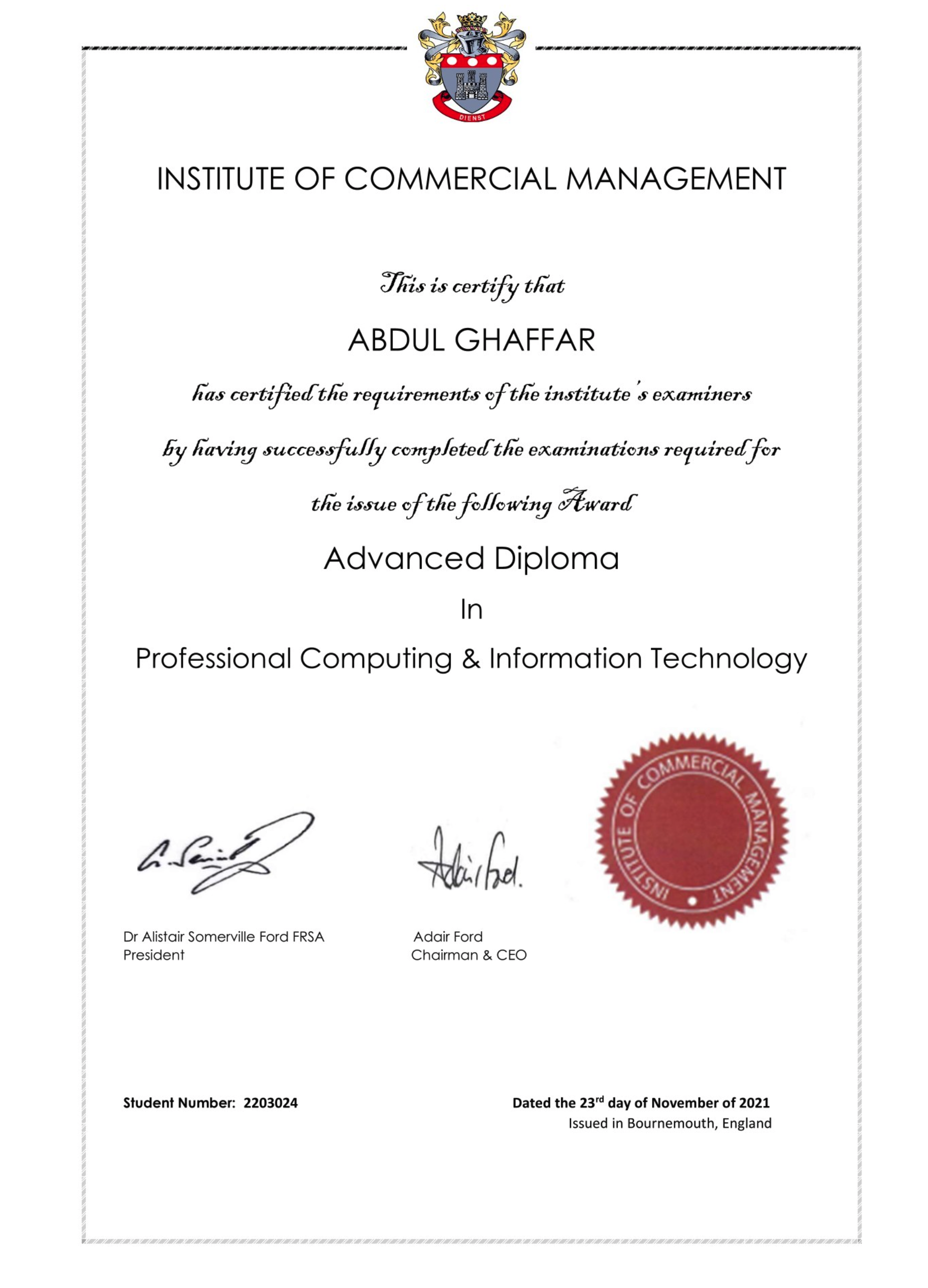 This Advanced Diploma is a professional certification that validates a comprehensive understanding of computing and information technology principles. The program's curriculum provided a robust foundation in essential areas, including: